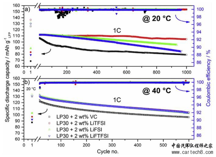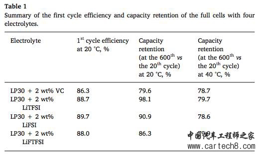 为了评估电解液在锂离子电池长期循环中的稳定性,Varvara Sharova还利用扣式电池制备了LiFePO4/石墨全电池,对添加不同添加剂的电解液在20℃和40℃下的循环性能进行了评估,下表为评估结果。从表中可以看到添加LiTFSI添加剂的电解液不仅首次效率要明显高于添加VC添加剂的电解液,在20℃下的循环性能更是具有压倒性的优势,循环600次添加LiTFSI的电解液容量保持率为98.1%,而添加VC添加剂的电解液的容量保持率仅为79.6%。但是在40℃度下循环时,这样的优势就消失了,所有的电解液都具有相近的循环性能。