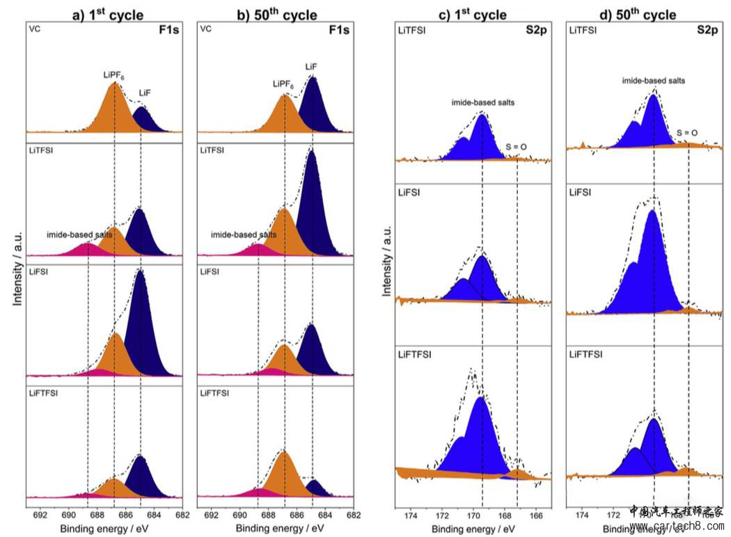 从上面的分析,我们不难看出酰亚胺类锂盐作为电解液添加剂时能够显著的提升锂离子电池的循环性能。为了研究LiTFSI等添加剂在锂离子电池内的作用机理,Varvara Sharova利用XPS对石墨负极在不同的电解液中形成的SEI膜成分进行了分析,下图为在第1次和第50次循环后,石墨负极表面形成的SEI膜的XPS分析结果。可以看到在添加LiTFSI添加剂的电解液中形成的SEI膜中LiF的成分含量要明显高于添加VC添加剂的电解液。进一步对SEI膜的成分进行定量分析表明,在第1次循环后,SEI膜中LiF含量的高低顺序为LiFSI>LiFTFSI>LiTFSI>VC>空白组,但是SEI膜在首次充电的过程中形成后并不是一成不变的。随着电池的循环,SEI膜的成分也在不断发生的变化,在经过50次循环后,LiFSI和LiFTFSI电解液中的SEI膜中的LiF成分分别下降了12%和43%,而添加LiTFSI的电解液中的LiF成分反而增加了9%。