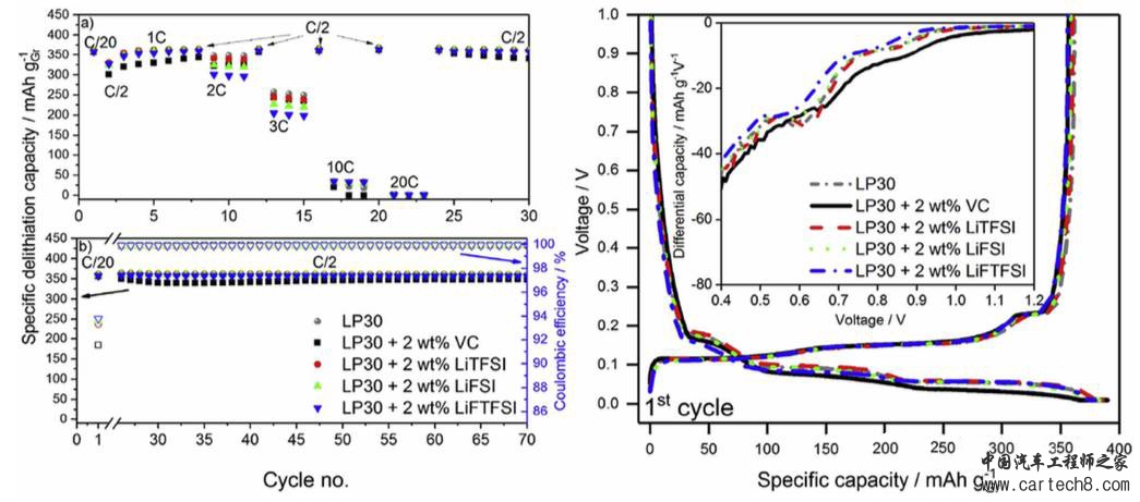 上图为石墨负极在不同的电解液中的电化学性能,从首次充放电的效率来看,空白组的首次充放电库伦效率为93.3%,添加LiTFSI、LiFSI和LiFTFSI的电解液的首次效率分别为93.3%、93.6%和93.8%,但是添加VC添加剂的电解液的首次效率仅为91.5%,这主要是因为在石墨首次嵌锂过程中,VC在石墨负极的表面发生分解消耗了较多的Li。