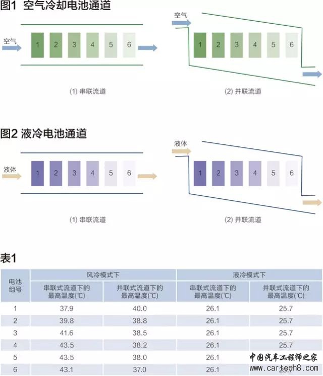 空气作为传热介质就是直接让空气穿过模块以达到冷却、加热的目的。很明显空气自然冷却电池是无效的,强制空气冷却是通过运动产生的风将电池的热量经过排风风扇带走,需尽可能增加电池间的散热片、散热槽及距离,成本低,但电池的封装、安装位置及散热面积需要重点设计。可以采用串联式和并联式通道(如图1所示)。
