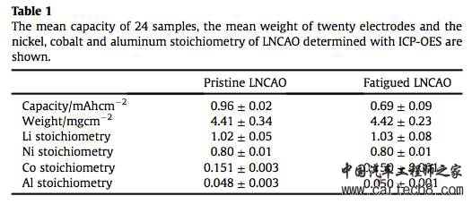 实验中Karin Kleiner采用了7Ah的圆柱型电池,电池分为两批,其中一批在8C(55A)的倍率下循环34周(50℃,40-80%SoC),另外一批电池进行了相同时间的存储,然后两批电池分别进行了拆解和分析,其中来自循环后的电池的材料称为fatigued LNCAO,来自存储后的材料称为pristine LNCAO,下表展示了两种材料的基本的物性指标。从表中数据可以看到,相比于存储的电池,循环后的电池容量衰降为26%±9%左右。
