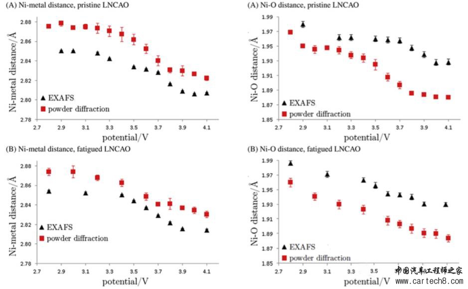 下图为没有循环的pristine LNCAO和循环后的fatigue LNCAO材料的Ni-metal距离和Ni-O距离在不同电压下的变化(分别采用EXFAS和Powder diffraction方法获得,两种方法存在一定的区别,但是最终的趋势是相同的)。从曲线上可以看到,pristine LNCAO在放电过程中Ni-metal的变化值为0.4A左右,但是经过循环后的fatigue LNCAO材料的Ni-metal的变化值只有0.3A左右,两种材料在高电势下Ni-metal值的差距更大一些,这表明在充电时循环后的fatigue LNCAO材料无法完全脱锂,这也解释了rh2物相存在的原因。