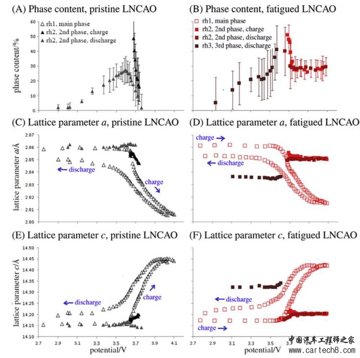 循环后的fatigue LNCAO材料中,我们在观察到从3.6V到4.1V都存在rh2物相,并且在4.1V下,rh2的物相占比约为27%,与LNCA在循环中的容量损失26%比较一致。而rh3物相,则在放电的过程中在较低的电势下观测到,但是在达到放电截止电压前就已经消失。我们不难发现,rh2物相和LNCAO材料在循环过程中的容量衰降有着密切的关系。