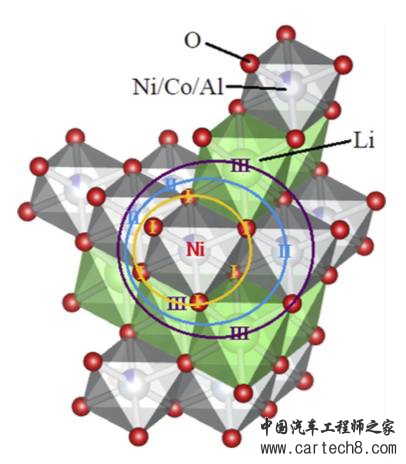 下图为LNCAO材料晶体结构中的一个小片段,图中围绕着Ni原子,作者画出了三个圆圈,分别为1,2和3,根据拉曼光谱的结果可以知道第一个圈是由O组成,第二个圈由Ni、Co和Al组成,第三个圈由Li组成。现在我们可以以三个圆圈中间的Ni元素为圆心,分别计算这三个圈到圆心的距离(Ni-O距离,Ni-metal距离和Ni-Li距离)。