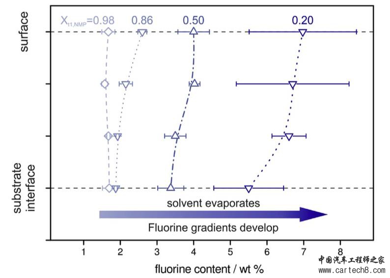 在一些纳米体系中,我们也观察到了烘干分层的现象。例如在较低的烘干速率下,较弱的颗粒-聚合物作用力可能会导致颗粒团聚,但是较强的颗粒-聚合物作用力能够促进形成更佳均匀的膜结构。在快速烘干的过程中,较弱的颗粒-聚合物作用力会导致聚合物在上-颗粒在下的分层结构,在较强的颗粒-聚合物作用力下,会产生颗粒在上-聚合物在下的结构。在高速烘干过程中,则会在溶液膜的表面产生一层“表皮”,这可能是最重膜分层的原因。