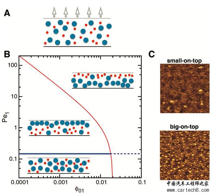 上面讨论的单组分溶液是一种理想的情况,实际生产中所使用的往往都是多组分混合的,例如多种特性、尺寸的颗粒,表面活性剂和聚合物等,每种组分都会赋予浆料不同的属性。我们现在假设一种含有两种尺寸颗粒的胶溶液,开始的时候这些颗粒在溶液中均匀的分布(下图A所示)。在烘干的过程中,由于溶液中存在两种颗粒,因此我们也就有两种Pe数:Pe1、Pe2,在一种情况下Pe1>1,而Pe2<1,此时大颗粒由于扩散比较慢,因而会在溶液的表层会富集较多的大颗粒,而小颗粒因为扩散速度比较快,因而分散比较均匀,最终会形成大颗粒在上层的分层结构。此外,在硬颗粒体系中,如果两个Pe参数都大于1(Pe1>1,Pe2>1),并且大小颗粒的粒径相差比较大(相差超过7倍),可能也会造成小颗粒在上层的分层结构。