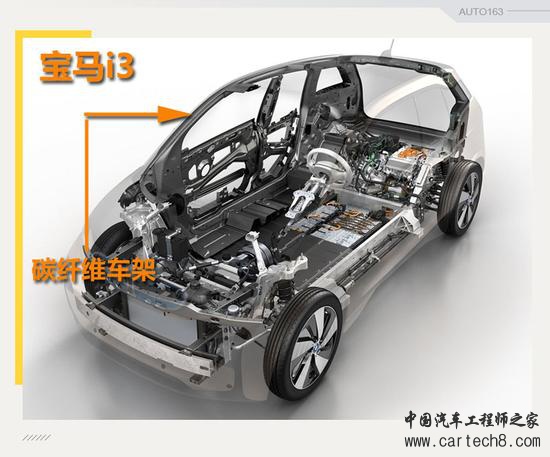为了在确保强度的前提下最大限度减轻重量,宝马i3首次在大规模量产的车型上使用碳纤维材料制造整个乘员舱,这也是整车企业的第一家——此前碳纤维车架都是那些超跑的专属,性能车充其量用一些碳纤维覆盖件而已。