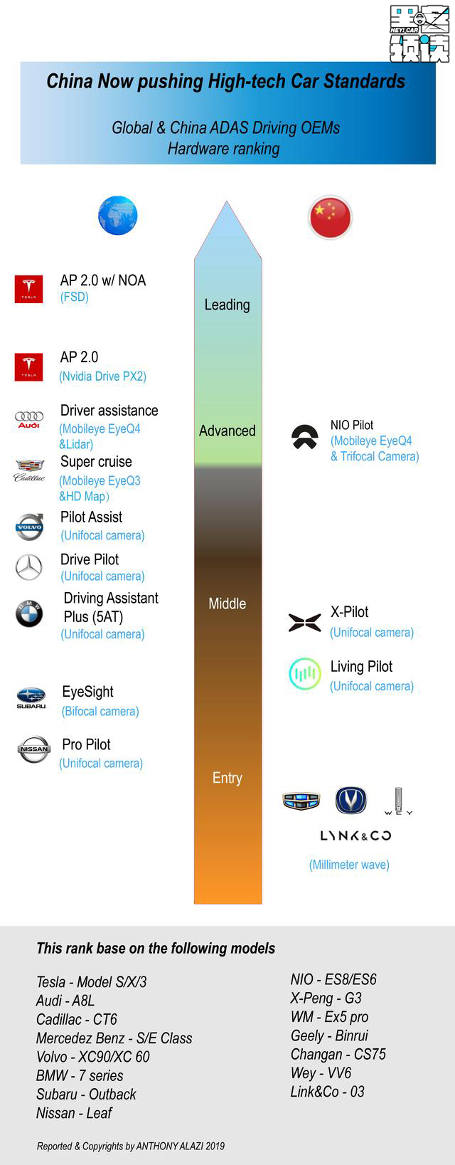 近日,外媒发布了一份全球自动驾驶硬件排名排行榜。该份排行榜从自动驾驶的硬件先进性方面将全球现售车型分为了4个阵营,分别依次是Leading(领导者)、Advanced(竞争者)、Middle(挑战者)、Entry(跟随者)。其中特斯拉 Model S(参数|图片)(参数|图片)/X/3、蔚来 ES8/ES6、奥迪 A8L(参数|图片)(参数|图片)……均被列入其中。