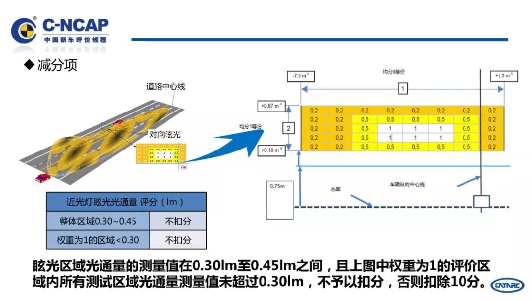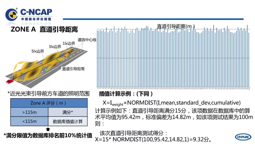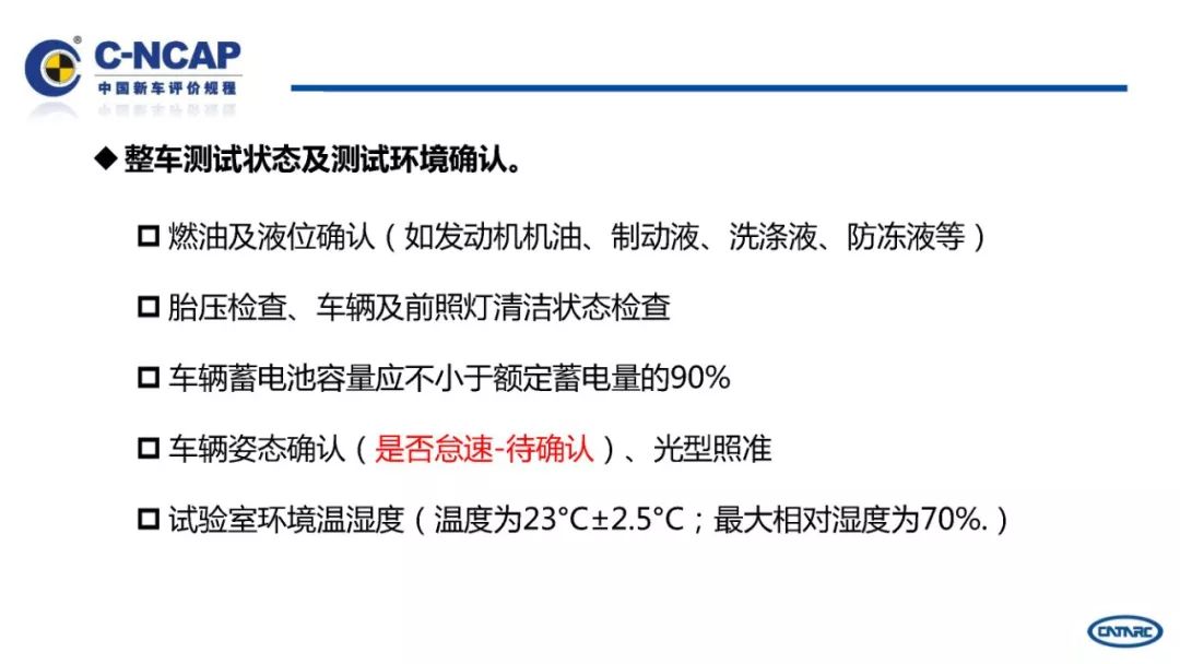 C-NCAP要求对一种车型进行车辆速度50km/h与刚性固定壁障100%重叠率的正面碰撞、车辆速度64km/h对可变形壁障40%重叠率的正面偏置碰撞、可变形移动壁障速度50km/h与车辆的侧面碰撞等三种碰撞试验,根据试验数据计算各项试验得分和总分,由总分多少确定星级。