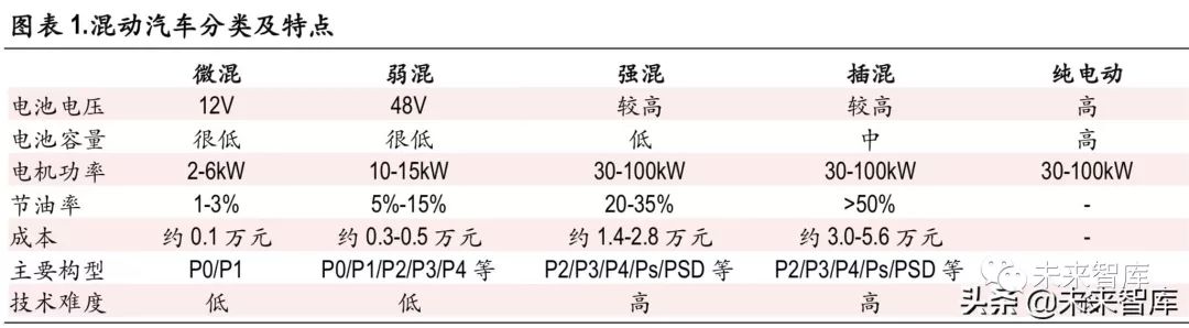 根据混合度(即电功率比例)的高低,混合动力汽车可以分为微混、弱混和强混等不同类型。不同 公司定义不同,目前尚无统一标准。一般来说,微混主要有 12V 启停,弱混主要有 48V 混动,而强 混包括常见的并联、串联及混联(含功率分流)等。不同混动系统的特性比较如下。