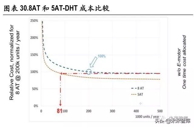 专用混动变速器前期开发成本较高。虽然专用混合动力变速器相对可以简单,但前期开发成本较高, 如果产量不能达到一定水平时,较高的研发成本摊销将导致最终成本比利用现有的自动变速器实现 附加式混合动力系统的成本高。只有达到一定产量时,开发专用混合动力变速器才具有经济性。下 图比较了传统 8AT 的成本与用于专用混合动力的 5AT-DHT 成本比较。以 8AT 年产 20 万台为 100%基准, 只有当 5AT-DHT产量超过 8.1 万台时,其成本才能降低到 8AT 大批量生产的水平。