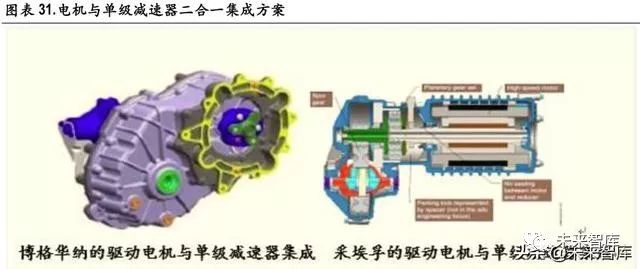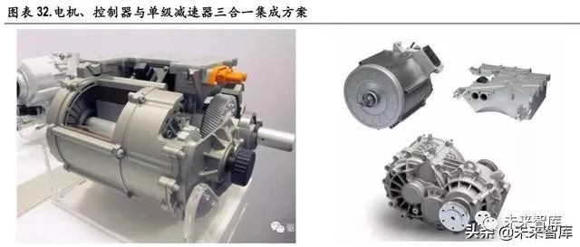在电驱动技术方面,集成化也是发展趋势,包括“二合一(电机+减速器)”方案,代表车型是雪佛兰 Bolt;以及“三合一(电机+减速器+电机控制器)”方案,代表车型是特斯拉系列。