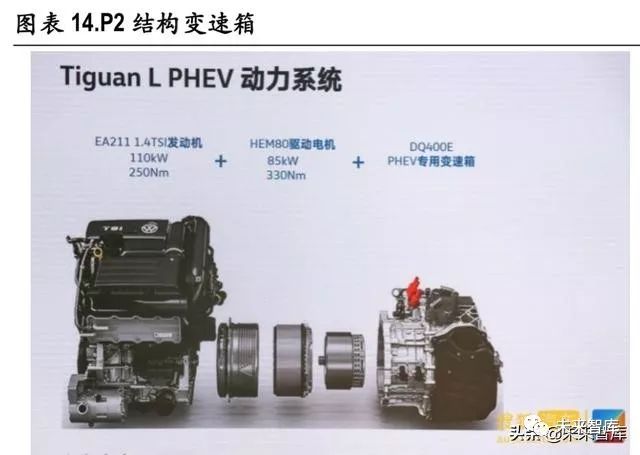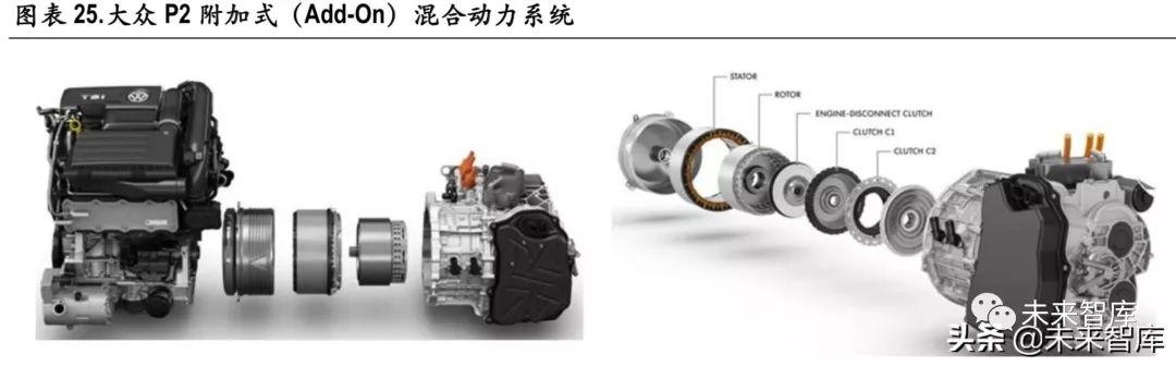 由于开发全新的混合动力系统开发成本较高,因此在混合动力市场有限的情况下,汽车厂以及变速 器公司倾向于选择在已有的自动变速器批量产品上做尽量少的改动,加入电动机实现附加式(Add-On) 混合动力系统。由于增加了一整套电驱动系统,动力总成比较复杂且价格昂贵,因此整车价格偏高, 普及率较低。目前应用附加式混动系统的主要有大众等,主要技术路线为并联。