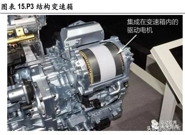 按照电机位置,并联式混动有 P2/3/4等不同构型。对于 P2 结构而言,混动变速箱与传统自动变速箱 差别较小;对于 P3 结构,部分将电机集成在变速箱内部,结构改动较大。