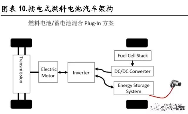 我们可以将燃料电池系统视为发动机或增程器,燃料电池汽车的架构类似于串联式混合动力,有插电式或不插电等不同形式。