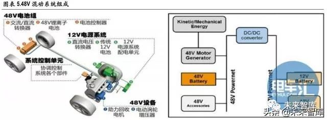 相比传统 12V 系统,48V 混动系统由于电池电压输出升高,降低了线路损耗,同时电压的升高也可以 有效改善起停电机、空调压缩机、冷却水泵等系统的工作时间,让发动机在停车状态最大限度不参 与工作;其次是 48V 的电压更能满足锂电池快速实现能量回收的要求,而回收的能量可用于辅助驱 动等,降低发动机负载,从而实现降油耗和排放的作用。