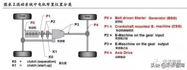 根据电机布置的位置,混动系统又可以分为P0/P1/P2/P3/P4等不同形式。