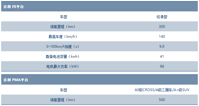 吉利在电动化方面大力投入研发新平台并且实现模块化,有效的降低了旗下新能源汽车的开发成本。其中FE纯电动平台是目前吉利最高产的纯电动平台,帝豪EV300就是基于FE平台打造。未来吉利还计划推出全新的纯电动平台PMA。基于PMA平台,吉利未来计划推出A0级CROSS、A级三厢车、A+级SUV。