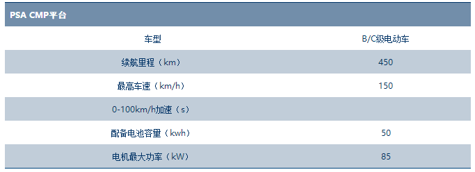 PSA曾宣布到2021年推出11款新能源汽车,其中4款将是纯电动汽车,剩余7款将是插电混动汽车。公司还宣布到2019年将推出两款新汽车模块化平台,并应用于新能源汽车的生产。其中,较大型平台名为EMP2(Efficient ModularPlatform,第二代高效模块化平台),较小型平台名为CMP(Common Modular Platform,共用模块化平台)。Autocar网站报道称,这两款新平台将首先应用于DS豪车品牌之上。PSA将和东风汽车(DMF)共同开发全电动化平台CMP,基于CMP平台将开发一些列经凑型城市车、轿车和SUV。