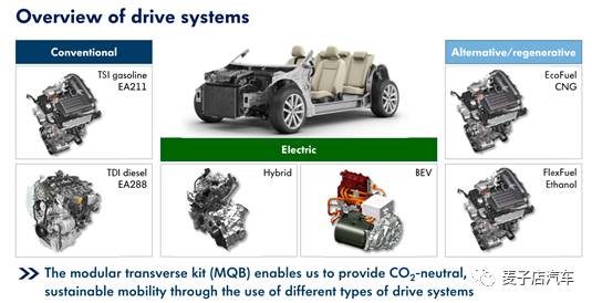 大众一直致力于旗下汽车的平台化建设,已经建立的汽车平台包括NSF、MQB、MLB和MSB。大众初期推出的电动车车型e-Golf就是基于MQB平台开发。基于MQB平台可以进行不同动力源车型的开发,以汽车底盘为基础同时开发众多接口,以这个接口为基础,可以拓展出众多外形、尺寸、轴距不同,但底盘布局有着重大相似性的不同车型。通过对轴距、悬架、轮距等部分的调整,MQB平台可以开发A00、A0、A以及B四个级别的车型。在大众的战略规划里,平台化策略与模块化策略密不可分。