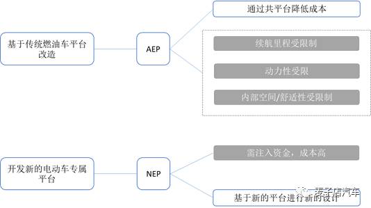 电动车平台:1)Adapted Electric Platform (AEP):旧平台改造,使用原来的传统车的平台,电动车设计去使用原来的平台。2)New Electric Platform (NEP):新平台,发开全新平台,可以使用全新设计。