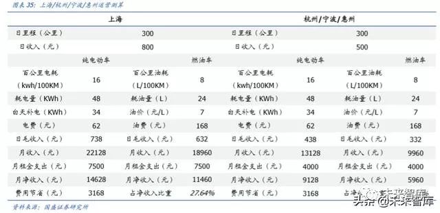 以上海网约车为例,网约车司机月租金费用约为 7500 元/月,日收入约 800-900 元,燃油车与纯电动车一致, 但电动车运营成本较低,每日可节省费用 100 元,一月可节省费用超 3000 元,与燃油车相比,净收入大幅提升。在杭州、宁波、惠州等城市这一费用节省更为明显,这些城市日收入约 500-600 元,月租金约 4000 元/月,占净收入比重达 53.15%,因此在这一地区司机更愿意租纯电动车跑运营,优势凸显。