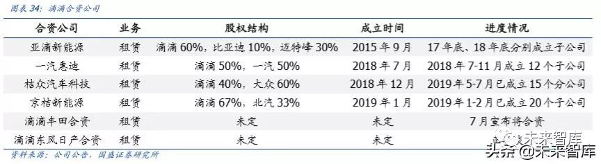 ➢ 与车企合作成立合资公司,加杠杆偏重资产模式投放运力。滴滴目前已先后与比亚迪、一汽、大众、北汽成立合资公司,与丰田、东风日产合资也在进一步推进。目前亚滴新能源主要投放在广深一带;京桔新能源在全国成立 20 个子公司后,2019年已开始密集投放北汽 EU5 车型;桔众汽车前期预计采购车辆为 10 万辆,其中 60%为大众新能源汽车。与车企合资优势在于:1)通过部分资本金加两次杠杆(股权以及财务杠杆),低资金投入撬动运力投放;2)车企可提供专属车型产品支持,降低采购及运维成本。对于车企而言,以租代售消化双积分压力的同时,可获得出行数据助力自动驾驶研发。