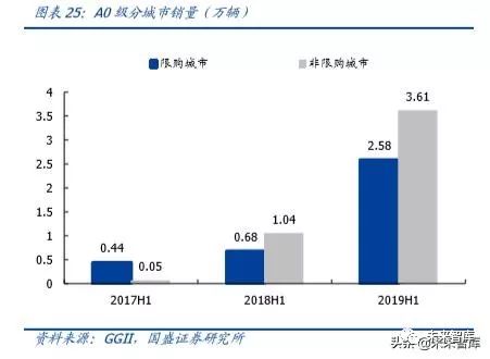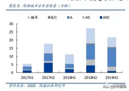 限购城市对 A00 级车型接受度相对较低,受市场容量限制,各车型占比有所下降。A00级车型在限购及非限购城市销量均出现萎缩,经济发达的限购城市对 A00 级车型接受度较低,2019H1 占比仅 12%,销量主要集中在对燃油微型车接受度较高的城市。其余车型相对均衡,占比均在 40-50%之间,但除 A0 级车型以外,占比均有所下降,主要因限购城市市场容量有限,这一趋势预计将维持。