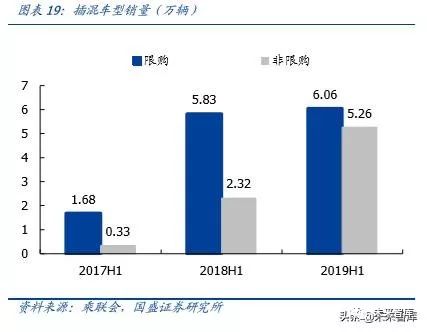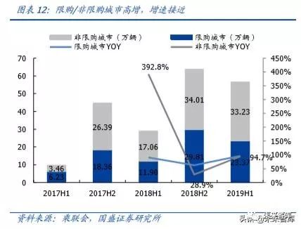 分车型来看,限购城市及非限购城市均高增,限购城市占比略有下滑。2019H1 六大限购城市及非限购城市分别实现销量 23.37/33.23 万辆,同比分别增长 96.4%/94.7%,增速较为一致。结构上,限购城市 2019H1 销量占比约 41.3%,相比 2018H2 略有下降。