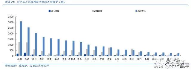 ➢ 观测点 1:非限购城市插混车型,稳步增长。非限购城市插混车型销量稳步增长,2019H1 销量 5.26 万辆,同比增长 126.7%,体量已与限购城市接近(受限于总市场容量),增长主要来自于销售城市数量的增加以及单一城市销量绝对额的增长。非限购城市插混车型的销量完全来自于自发性需求,在没有牌照因素驱动下,且相比同款的燃油车型单价高约 3-4 万元,非限购城市消费者购买插混车型代表其愿意为差异化的动力性能支付溢价。