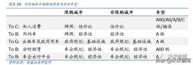 ➢ To C 端:私人消费为主,过去有部分网约车,但在网约车新规执行力度趋严后,大幅减少。限购城市驱动力主要为牌照,其次为性价比(为差异化的动力性能支付溢价);非限购城市则主要为性价比(为差异化的动力性能支付溢价抑或驾驶方便,使用成本低)。车型上 1)纯电动 A 级车及以上、插混车型:消费群体类似,有一定经济实力的男性消费者,喜欢新能源汽车差异化的动力性能。2)纯电动 A00 级、A0级车车型:消费群体类似,女性消费者,家庭第二辆车,主要起代步作用如买菜、驾驶简单、停车方便。
