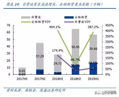 分用途来看,非营运需求高速增长,出租租赁表现更为亮眼,占比提升至约三成。2019H1非营运销量 39.66 万辆,同比增长 60.5%,出租租赁实现销量 16.93 万辆,同比增长387.2%。出租租赁占比持续提升, 2019H1抬升明显,占比已提升至29.9%,相比2018H1大幅提升 17.9pct。
