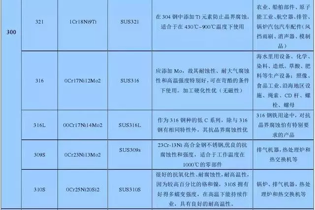 9、347不锈钢。铌稳定化的奥氏体不锈钢,添加铌提高耐晶间腐蚀性能,在酸、碱、盐等腐蚀介质中的耐蚀性同321不锈钢,焊接性能良好,即可作耐蚀材料又可作耐热钢使用,主要用于火电、石化领域,如制作容器、管道、热交换器、轴类、工业炉中的炉管以及炉管温度计等。
