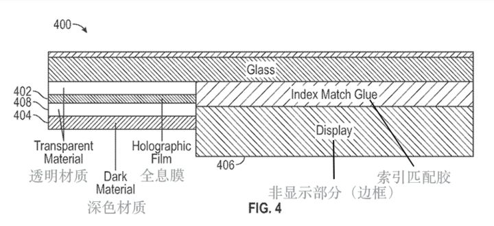 通过查看专利文件中的描述内容,可以发现这块“全息装饰玻璃”主要分为两个部分,一部分是全息玻璃,利用全息膜放入玻璃或透明材质的下方,显示全息图像;另一部分是使用了折射率匹配胶的屏幕边框。折射率匹配胶可以改变边框部分的颜色和外观,使其匹配全息玻璃的颜色。
