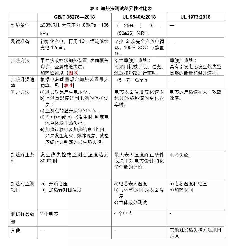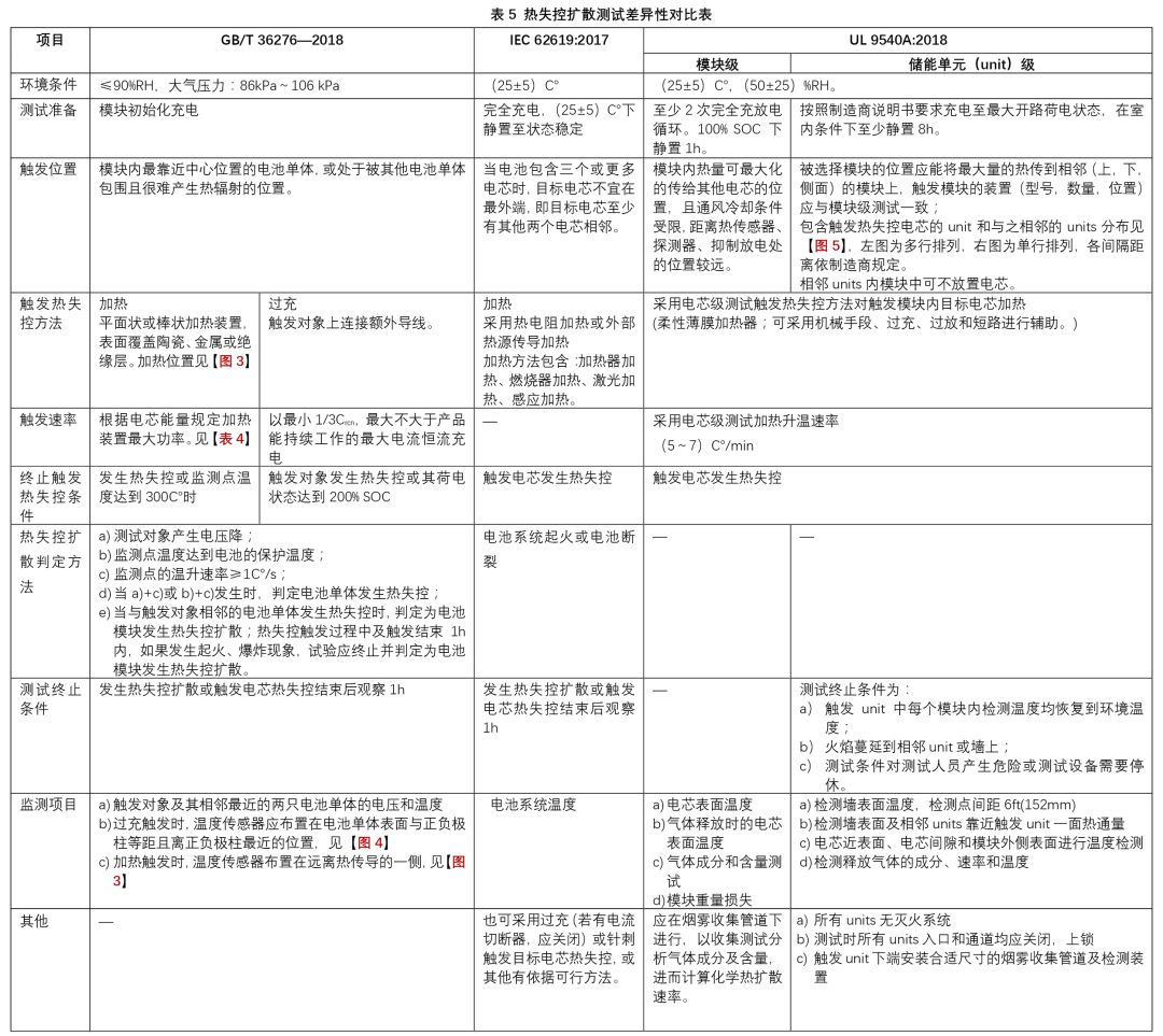 目前,包含储能用电池热失控要求和测试方法的相关标准有GB/T 36276—2018, UL 9540A:2018,UL 1973:2018,各标准应用情境不尽相同,因此在技术要求、触发热失控方法、测试手段等方面存在差异,差异性汇总如表3所示▼