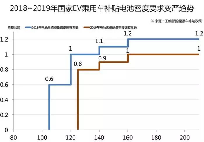近三年来,新能源车补贴标准严格化趋势就是最好的例证。自2017年开始,在纯电动车补贴标准将电池能量密度纳入考量后,2018年及2019年继续对电池能量密度的准入门槛及要求水平提出严苛限制(目前国家补贴金额=标准补贴额*电池能量密度加权值*电池能耗率系数),倒逼车企电池进行技术升级。