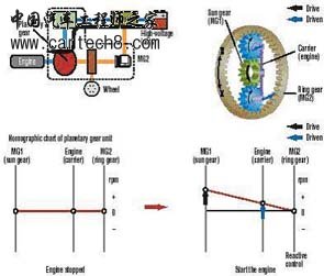 普瑞斯(Prius)的核心是动力输出设备,即行星齿轮盒,它将电力发动机、发生器和电动马达联结在一起(图6)。如并联混合动力系统中,这使得汽车运行可以是电动马达独立提供动力,也可以是汽油发动机独立提供动力,或者两者同时提供动力。