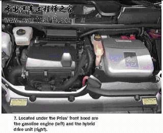 电子马达连接在齿轮组的环形齿轮上,也连接驱动车轮的差速器。因此,电子马达的自转速率和环形齿轮决定车子的速度。 发电机被连在齿轮组的中心齿轮上,而引擎连接着行星齿轮架。环形齿轮的速度由三个部件共同决定,它们必须同时工作以控制输出速度。 所有的32位微处理器单元被用于发动机控制模块(ECM)、高压电控制单元(ECU)、电池的ECU和刹车控制ECU。这表明由早期的16位设计升级了。交互式通讯通过控制器区域网络总线发生。 先进的电池设计 NiMH电池由168节1.2V直流电池组成,用28个电池模块互相连接,以产生201.6V的名义直流电压,被安置在一个耐冲击的容器内,置于汽车后坐下。现在,电池连续不断的改良已到第三代。(用在Toyota的Lexus RH400h和Highlander运动型多用途运载车上的电池是第四代设计。)发动机罩下,有发动机、变速器组和混合动力驱动桥。(图7)