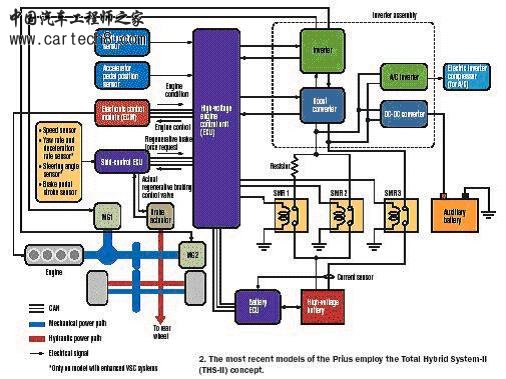 混合动力系统技术 Prius设计是基于Toyota称之为混合动力协同驱动概念。此概念目标是协同电动马达动力和汽油发动机动力,并使汽车功率和环境性能最大化成为可能。 Prius最近的型号是基于Toyota混合动力总系统II (THS-II)技术。THS-II系统的每个连续世代的产品改进了汽油燃效和减少散热,包括一个同轴的4缸1.5升发动机,一个高压镍氢电池(NiMH),一个带行星齿轮系统的智能混合动力驱动桥和一个复杂的发动机控制部件(图1)。