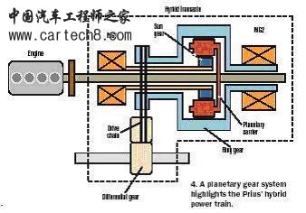 在并联混合动力系统中,汽油发动机和电动马达都直接驱动车轮。除补充发动机的原动力之外,电动马达还可作发生器,在汽车运行中给电池再充电。 Prius用两块永久磁铁500-V交流马达发生器:MG1和MG2。两个马达都是由变压器组驱动,该变压器组将电池的直流电压转换成交流电高压。一个混合动力驱动桥和行星齿轮系统连接两个发动机和两个发生器。(图2)