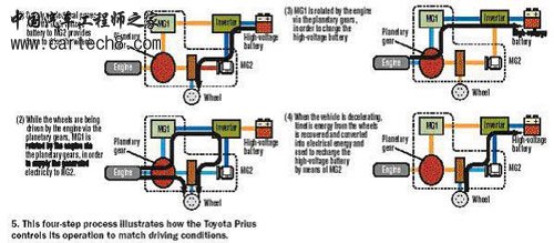 由于MG1和MG2从1040rpm到5600rpm产生67hp的输出,MG1和MG2不需要汽油发动机的帮助就有足够的扭矩发动汽车。Prius发动机运转的最大速度仅5000rpm,供给75hp输出。 首先,高压电池供应电力给MG2,以驱动车轮。当发动机轮通过行星齿轮被发动机驱动,MG1被发动机带动旋转供应发生电流给MG2。接着,发动机通过行星齿轮使MG1旋转给高压电池充电。汽车减速时,轮子的动能被恢复转化成电能,以通过MG2用之于高压电池充电(图3)。这就是著名的“再生制动”。