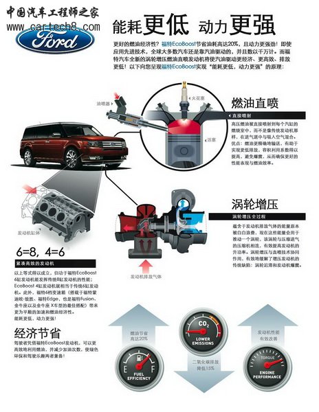 福特EcoBoost新动力技术是福特汽车公司可持续发展战略近期解决方案中的核心技术,可应用于4缸和6缸发动机。它采用涡轮增压燃油直喷技术,在使汽油发动机的燃油经济性提升达20%、二氧化碳排放降低15%的同时,还能可缩小发动机尺寸,而增强其扭矩和性能。
