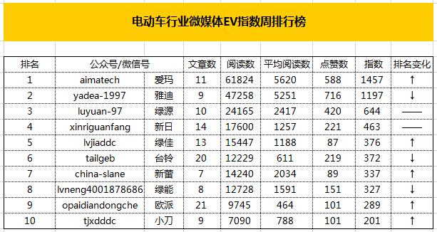 行业品牌微媒体EV指数周排行榜是电动车时代网数据研究中心以微信平台为数据来源,面向各电动车品牌在微信平台所发布的文章数量及质量而做出的统计,将于每周三发布上一周数据,敬请关注。