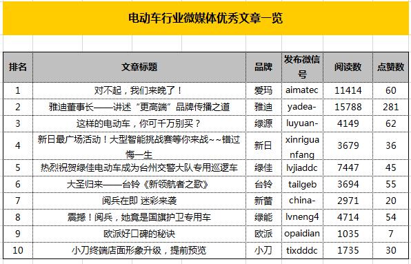 微信公众号作为电动车一、二线品牌官方传播渠道,是一种行之有效的方式,文章发出后传播速度快而且成本低,效果也比较明显。下面附上电动车品牌微媒体优秀文章一览表,仅供行业人士参考。