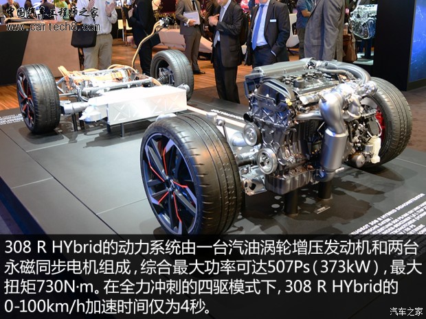 尽管还是概念产品,但可以看到308 R HYbrid的外形设计已经非常成熟,十分接近量产状态了。与量产普通版本的标致308 S相比,凶悍的外观设计显然是其吸引眼球的原因之一,但在外表之下的内在实力才是这台概念车真正令人咋舌的地方。