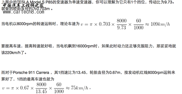 比如特斯拉Model S的最大转速是16000转,日产Leaf(启辰晨风)也有10390转。而一般的汽车内燃机红线转速也就6000转,跑车也就8000转。在单减速比的情况下,车速和发动机转速成固定比例。其公式是: