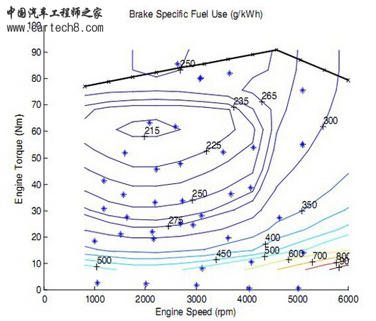 下面这张图是本田insight上的1.3升发动机的BSFC图,图中像等高线一样的圆圈表示的的是每单位(千瓦时)做功消耗的燃油量(克),数值越低越好。大概能看出,大部分转速和负载落在300g/kwh的等效率线以内,而最优区间的燃油消耗率是215g/kwh,前者是后者的1.4倍。