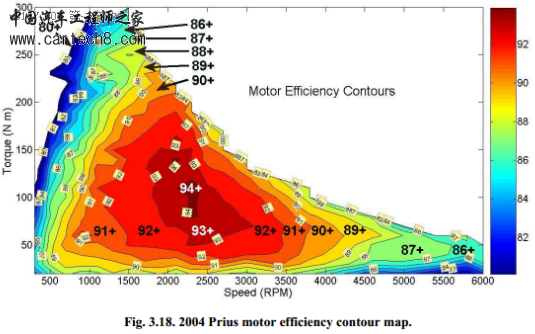下图则是二代prius的主电机的经济性图,等高线的单位变成了电机效率,也就是单位消耗的电量(千瓦时)做的功(千瓦时),数值越高越好。大部分负载和转速都落在89%等效率线以内。而最优区间效率超过94%。换算成单位做功消耗电量,也就是112.4%和106.4%,前者是后者的1.056倍。