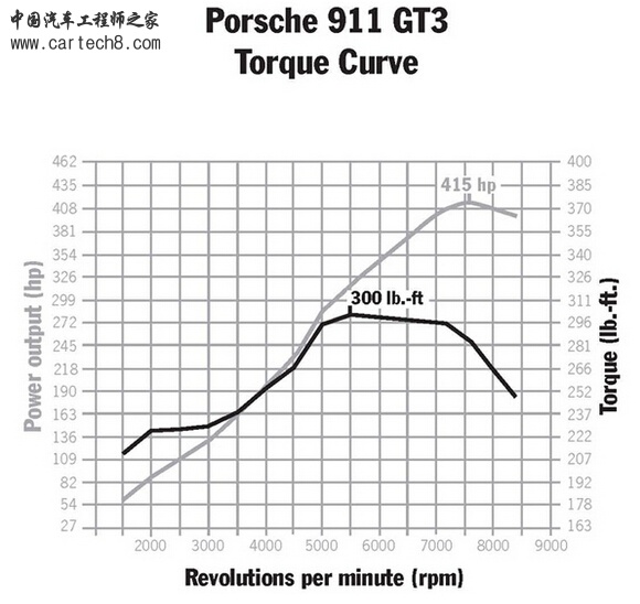 还是以保时捷911和特斯拉Model S为例。911 GT3的外特性曲线或说最大扭矩/功率曲线如下图(lb·ft即磅英尺,跟牛顿米一样,是一个扭矩单位),可以看出,随着转速不同,911 GT3的功率变化是巨大的,7500转左右输出的功率是14500转时的近8倍: