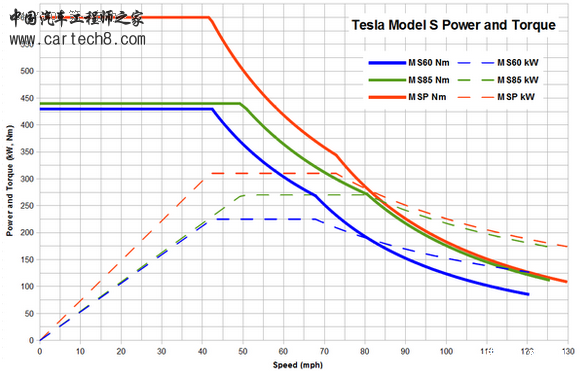 当然,我们从上面那张图中也能看出,model S P85的电机的功率曲线也不是完全平坦的,高于72MPH以后,会有缓慢的下降,此时如果有2档能够通过降低减速比,降低发动机转速,能够输出更大的轮上扭矩,但是因为这种高速本身也不常用,所以意义不大。